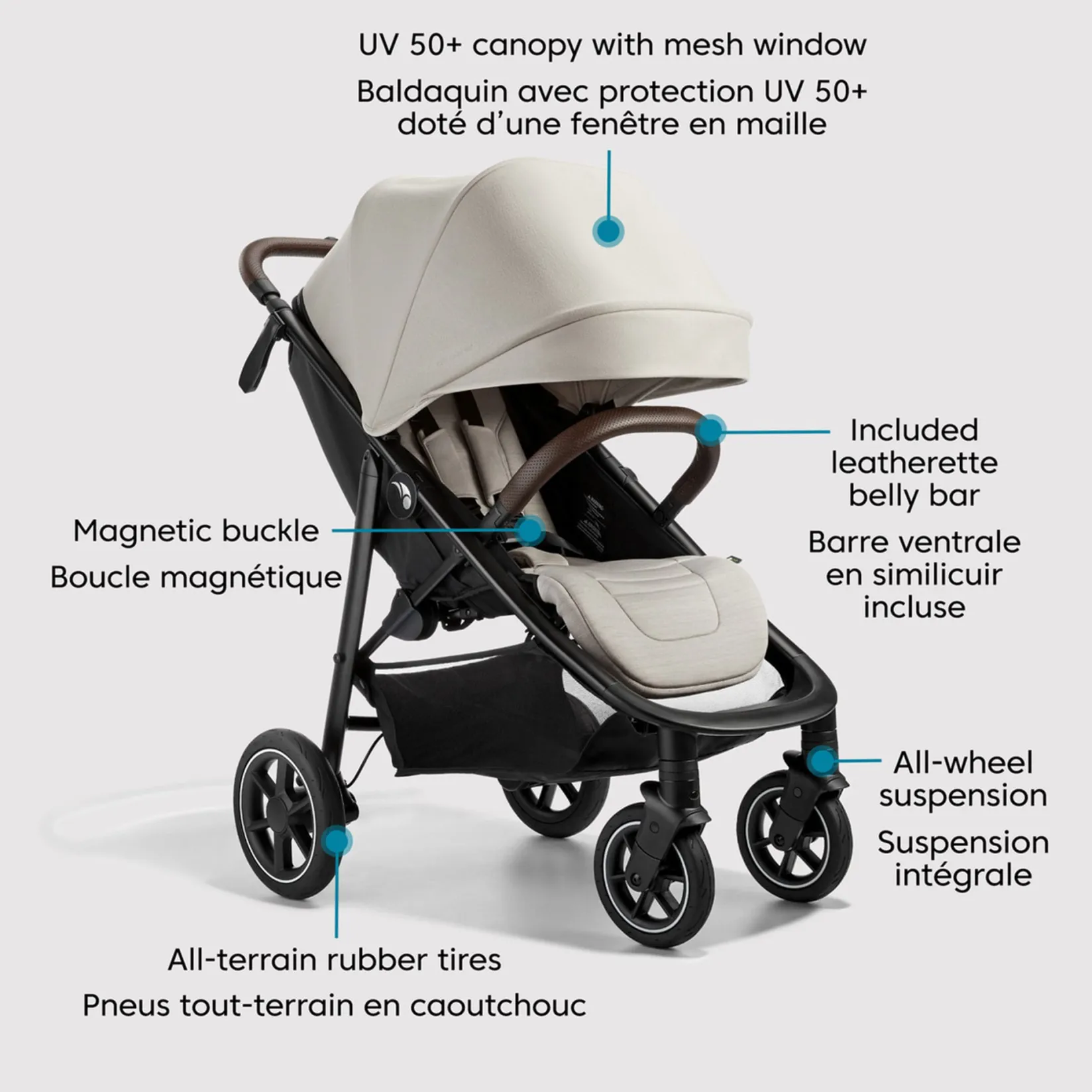 -Adjustable leatherette handlebar and parent cup holder for on-the-go hydration.