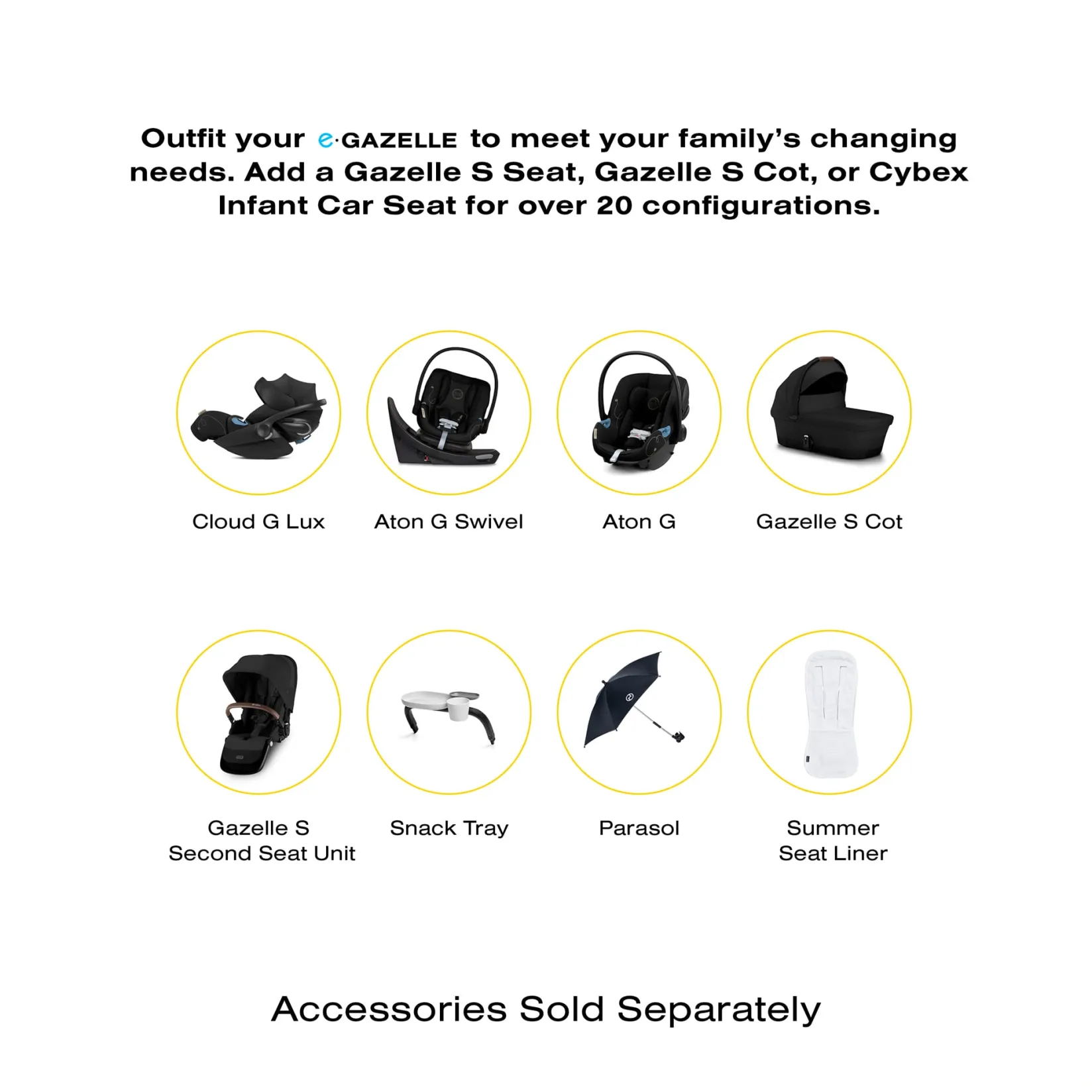Accessories available for purchase: Gazelle S Second Seat, Gazelle S Cot, Any CYBEX Infant Car Seat, Snack Tray, Parasol, and Summer Seat Liner