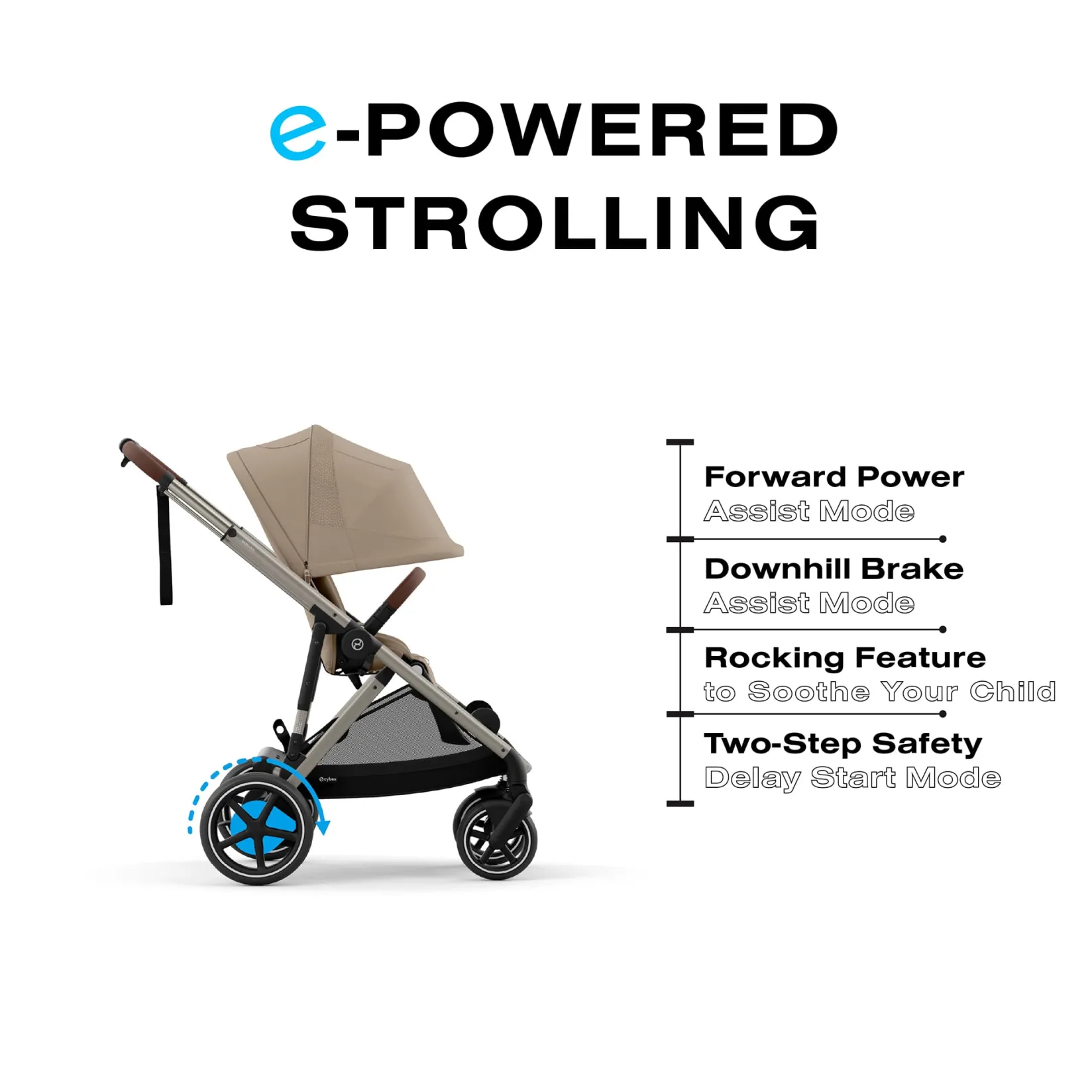 A stroller for all your adventures ahead. The CYBEX e-Gazelle stroller combines adaptability and convenience with the electric power of smart technology. Conquer any uphill climb or downhill descent and cruise through any uneven terrain effortlessly with the assistance of our electronic power on demand. Adapting to the changing needs of your family, the e-Gazelle is designed to support 20+ different configurations and easily converts from a single to double stroller. Whatever your plans are for the day, you can rely on the shopping basket and spacious lower basket for up to 55lbs. of groceries or any essentials for the journey ahead. After a long busy day, use our gentle rocking feature to help calm and soothe your child.