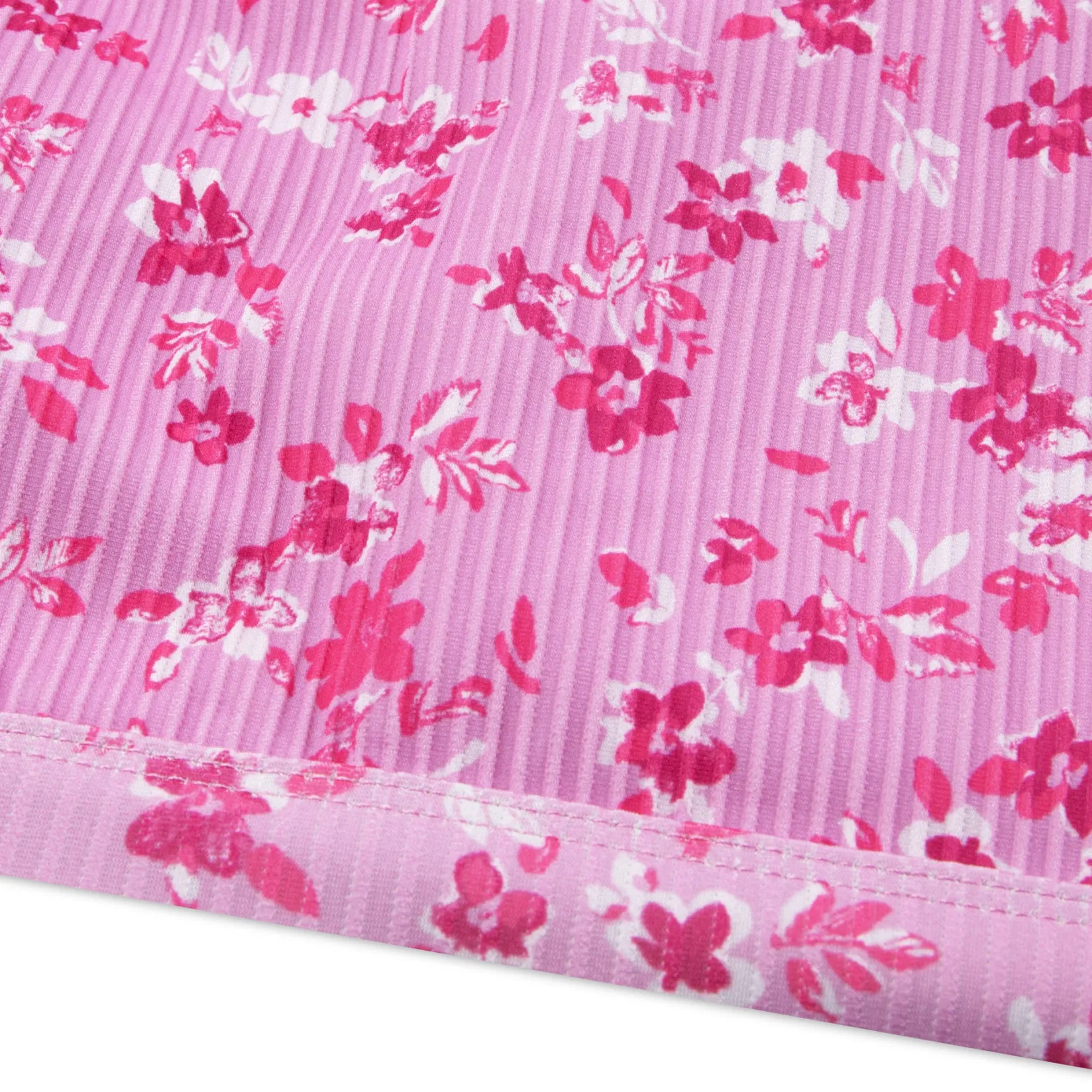 Both pieces are made of jacquard swim rib knit fabric and finished with an allover floral print Top: Double scoop neck. Encased elastic band. Fully lined • Bottom: Bikini cut. Encased elastic waistband. Solid binding trim. Fully lined