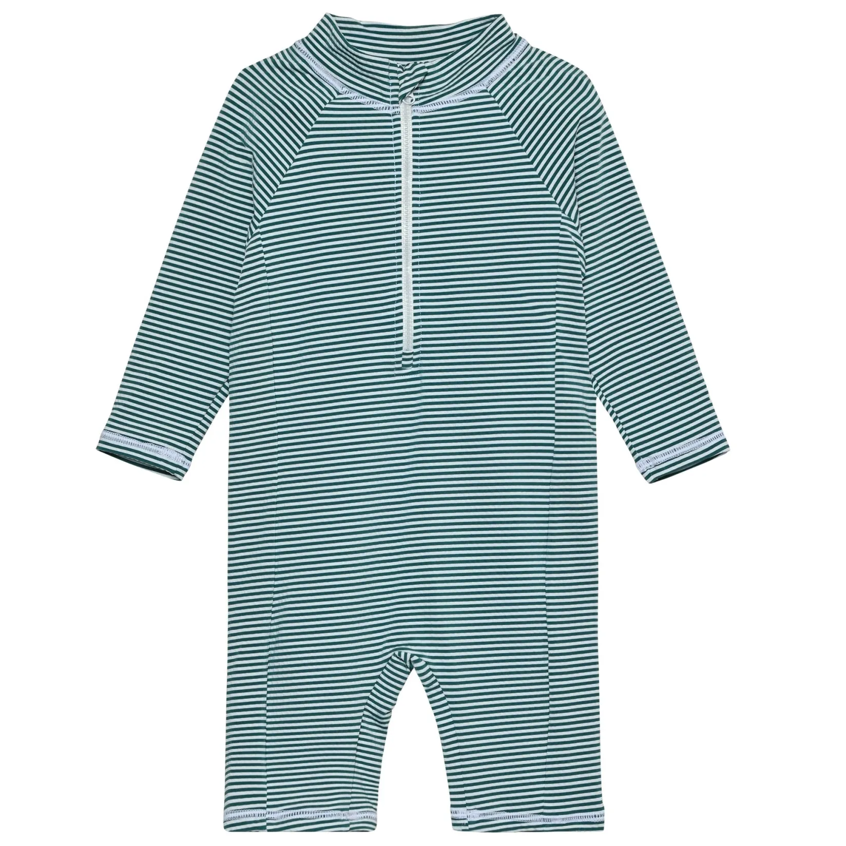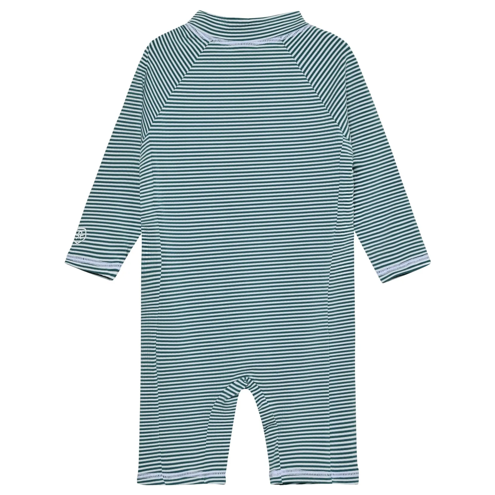 OEKO-TEX® STANDARD 100 Cert. No. 2276-364 DTI, Tested to UV STANDARD 801 UPF 60+ Swimsuit with long sleeves and a striped pattern from Color Kids. The swimsuit has a front zipper and is both flexible and comfortable. Certified acc. to OEKO-TEX® STANDARD 100 Cert. No. 2276-364 DTI Tested and certified acc. to UPF 60+. To determine the UPF rating, the fabric is tested in both new and used conditions, following the UV STANDARD 801 method. The entire product is then CE-certified under PPE regulations.
