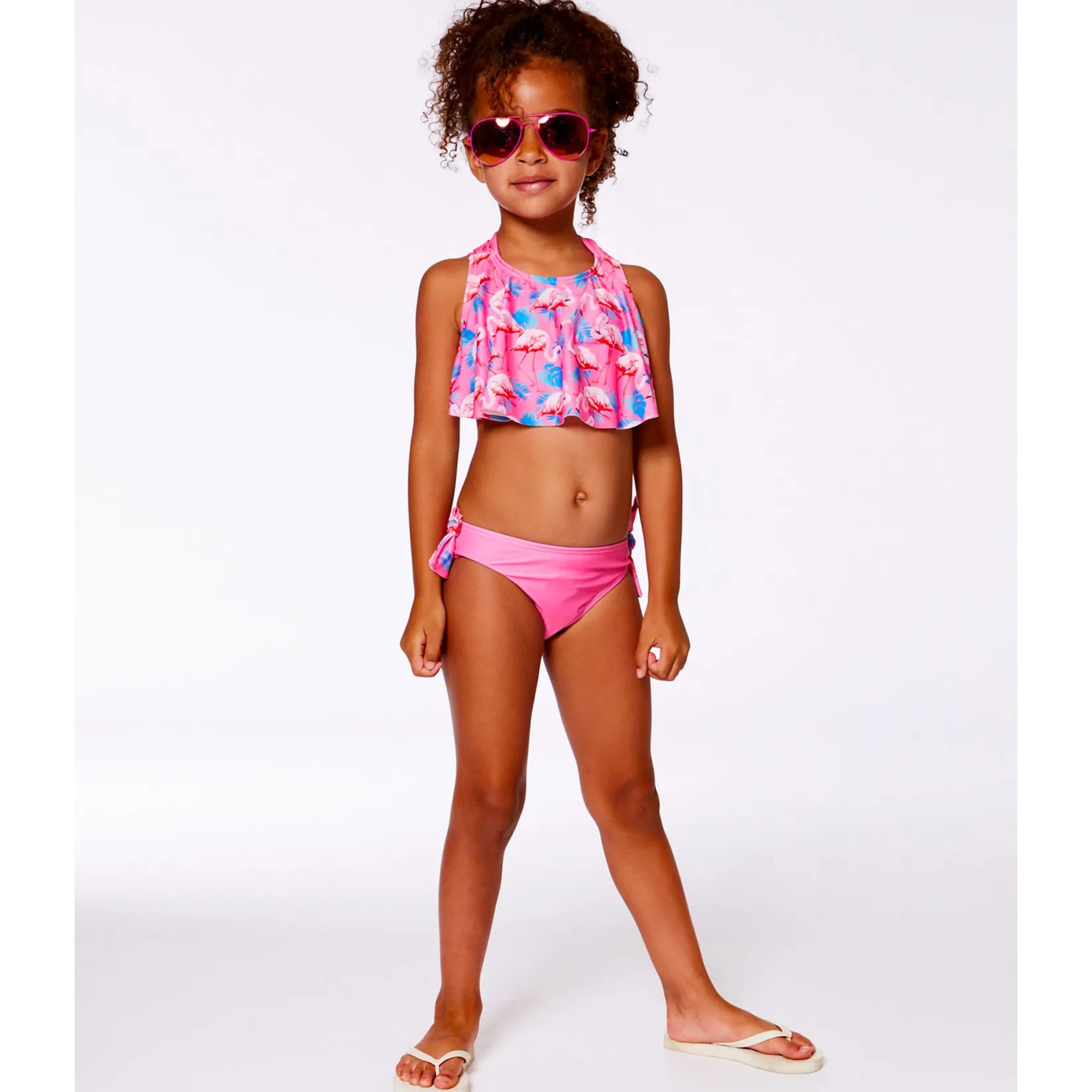 Offering a bold tropical style, our candy pink flamingo print two-piece swimsuit is a must-have for the spring and summer seasons! This adorable swimsuit has a ruffled top with multi-string straps, a macrame accent at the back, and a scoop neck. We paired it with coordinating solid pink bikini bottoms with flamingo print side ties.
