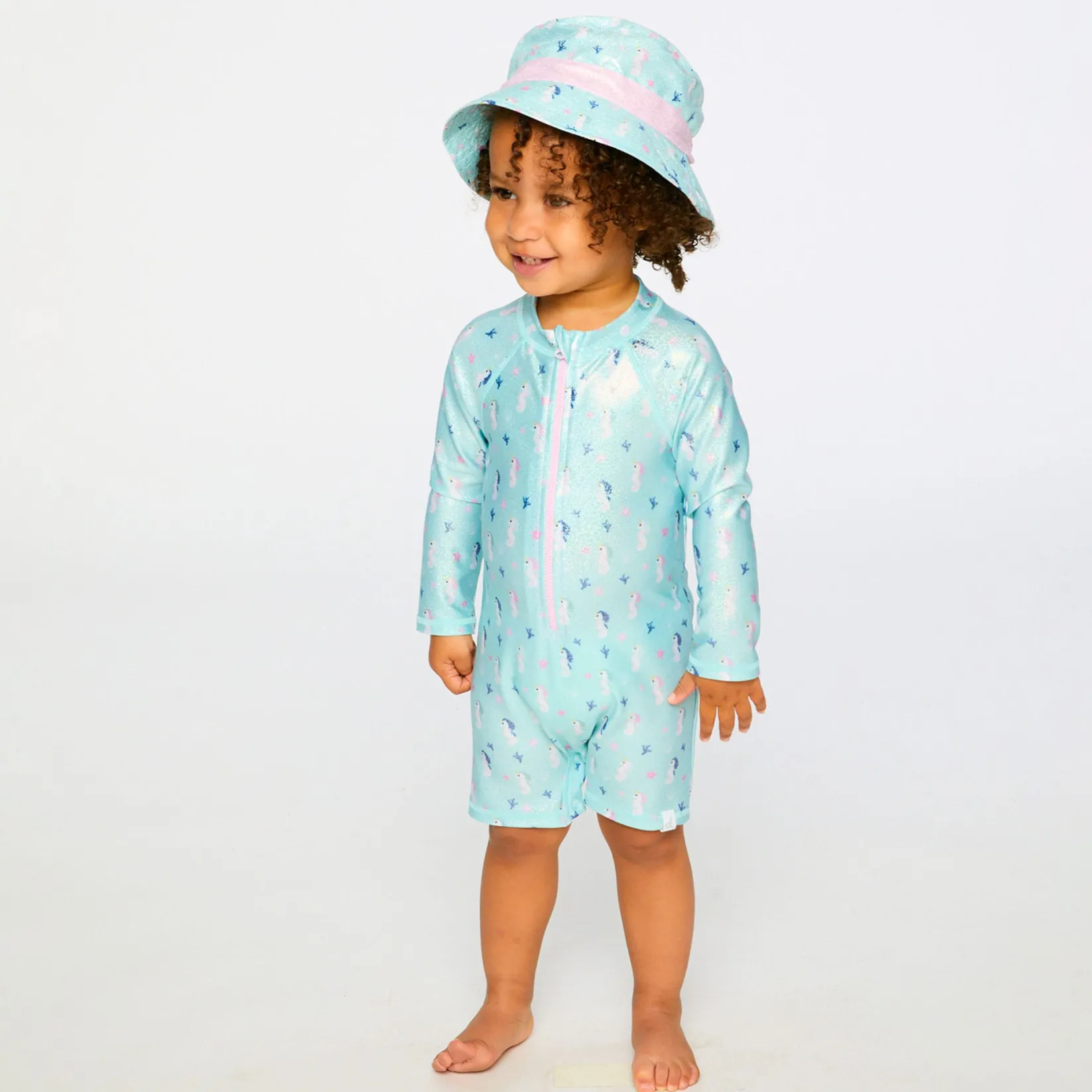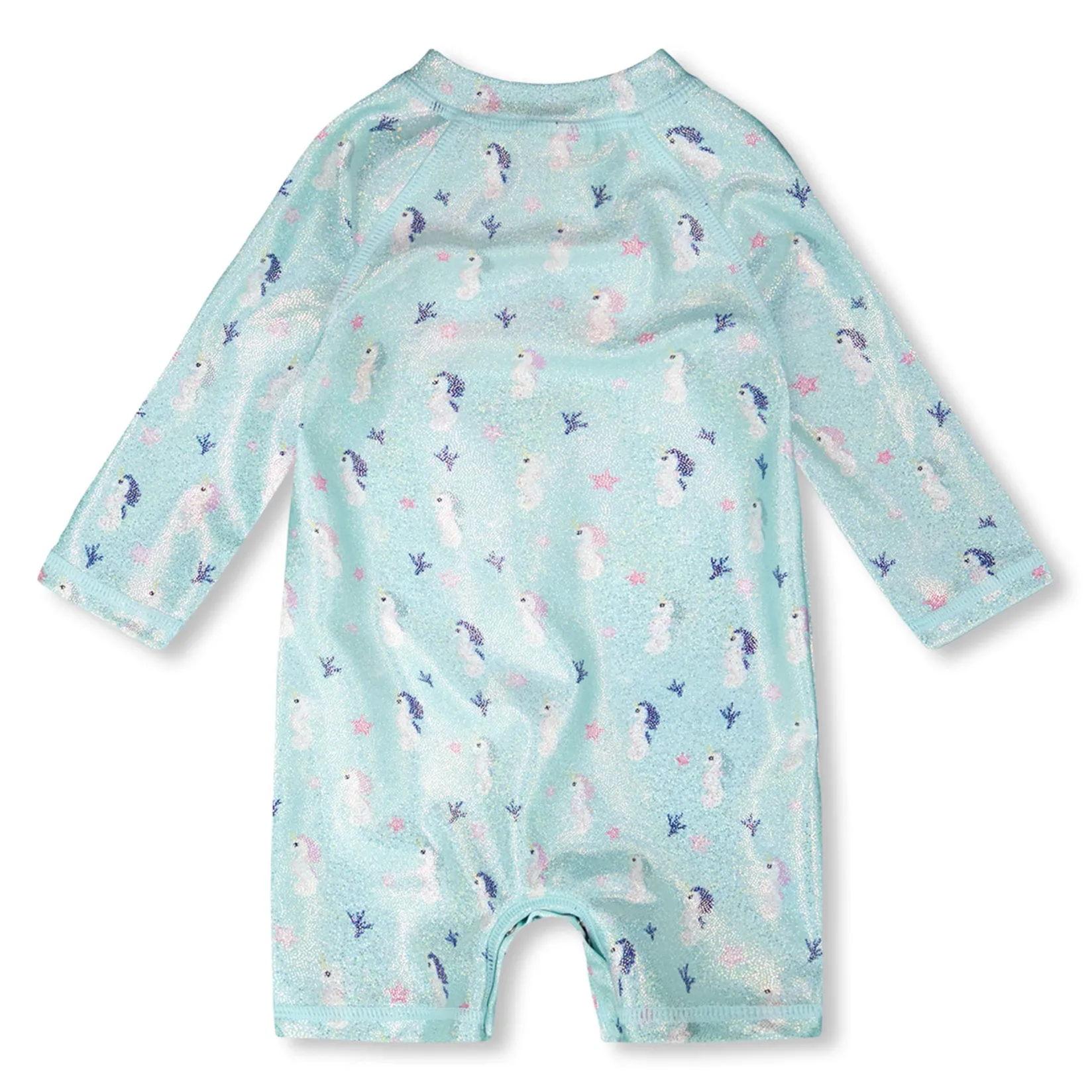 The baby and toddler one-piece long sleeve rashguard in blue with seahorse print is a playful essential for little girls at the beach or pool. This long-sleeve swimsuit features an allover seahorse print on a soft blue background, a mock neck, bottom-snap closure and a front zipper for easy dressing. Made from recycled polyester with added stretch, it offers sun protection, comfort, and style for splashing around all summer long.