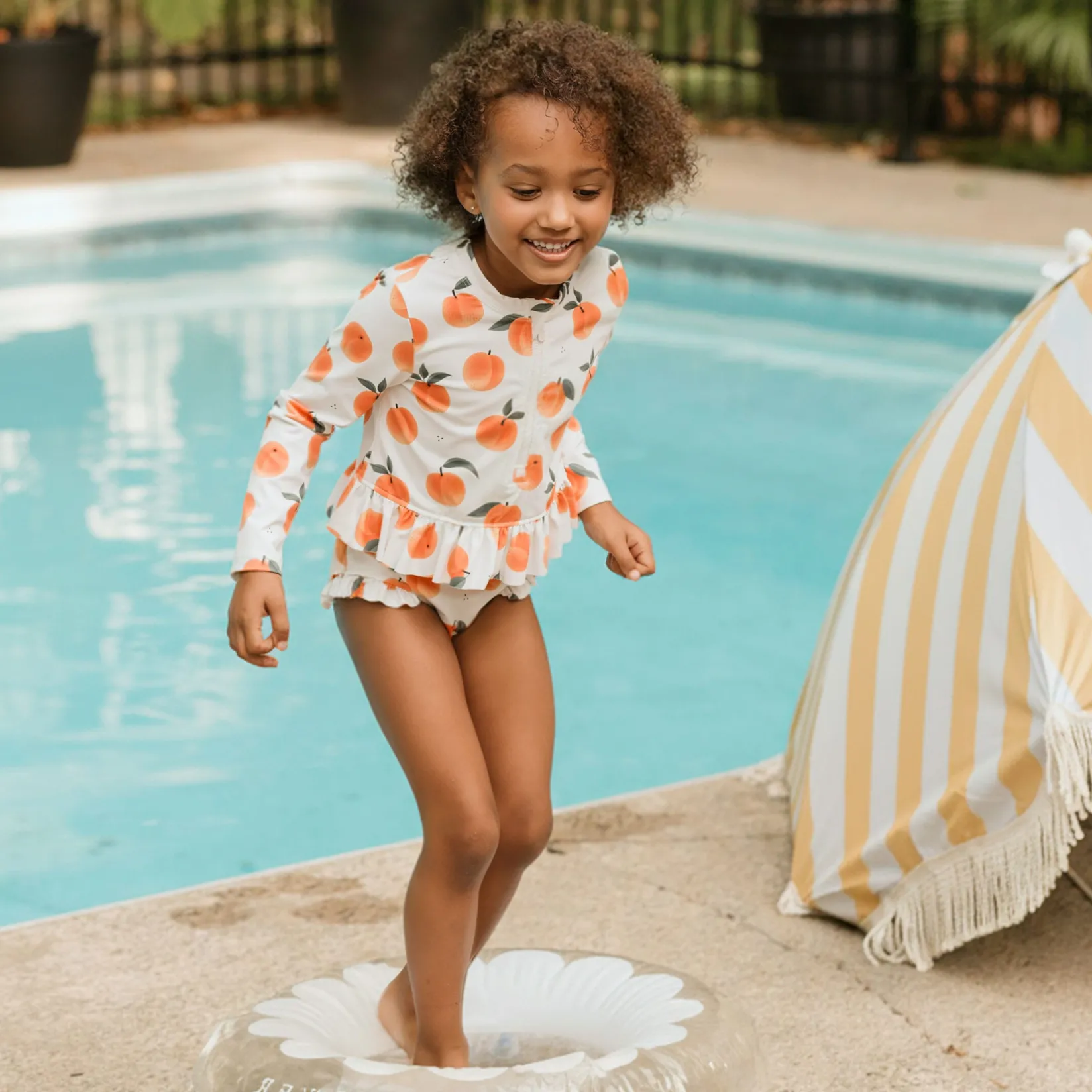 Set her up for sweet summer adventures with this adorable Peaches Print Rash Guard Set. Made for sunny days by the water, this long-sleeved rash guard keeps her covered up while having fun and the ½ zip down the front makes it easy to pull on and off. The coordinating swim bottoms have a frilly trim and keep her comfy while she splashes and plays. Lightweight, quick-drying and designed with built-in UPF50+, she’s free to dive from pool to picnic and back again.