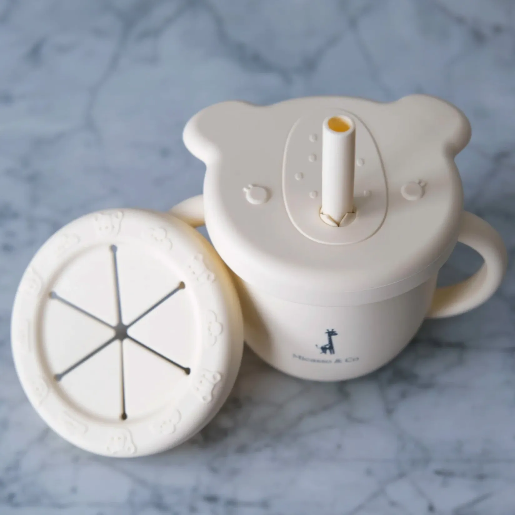 The 2-in-1 silicone cup by Micasso & Co is not only highly resistant, durable, and aesthetically pleasing, but it also doesn’t easily spill. The removable lid features a wall that makes it very sturdy and not easily removable by your little one’s hands. Consequently, the lid stays securely in place during use.