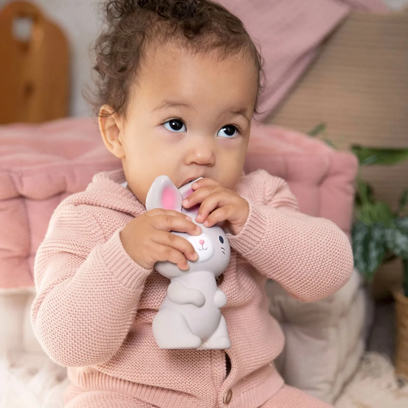 Help soothe baby’s sore gums with the Sylvi Natural Rubber Teether Toy. Made of all-natural rubber, this rabbit-shaped teething toy helps ease sore gums and stimulates all of baby’s five senses with sounds, textures, and more. Large and easy for infants ages 0 months and up to grasp, and baby will delight in exploring Sylvi’s textures and sounds with every grasp, squeeze, and chew.