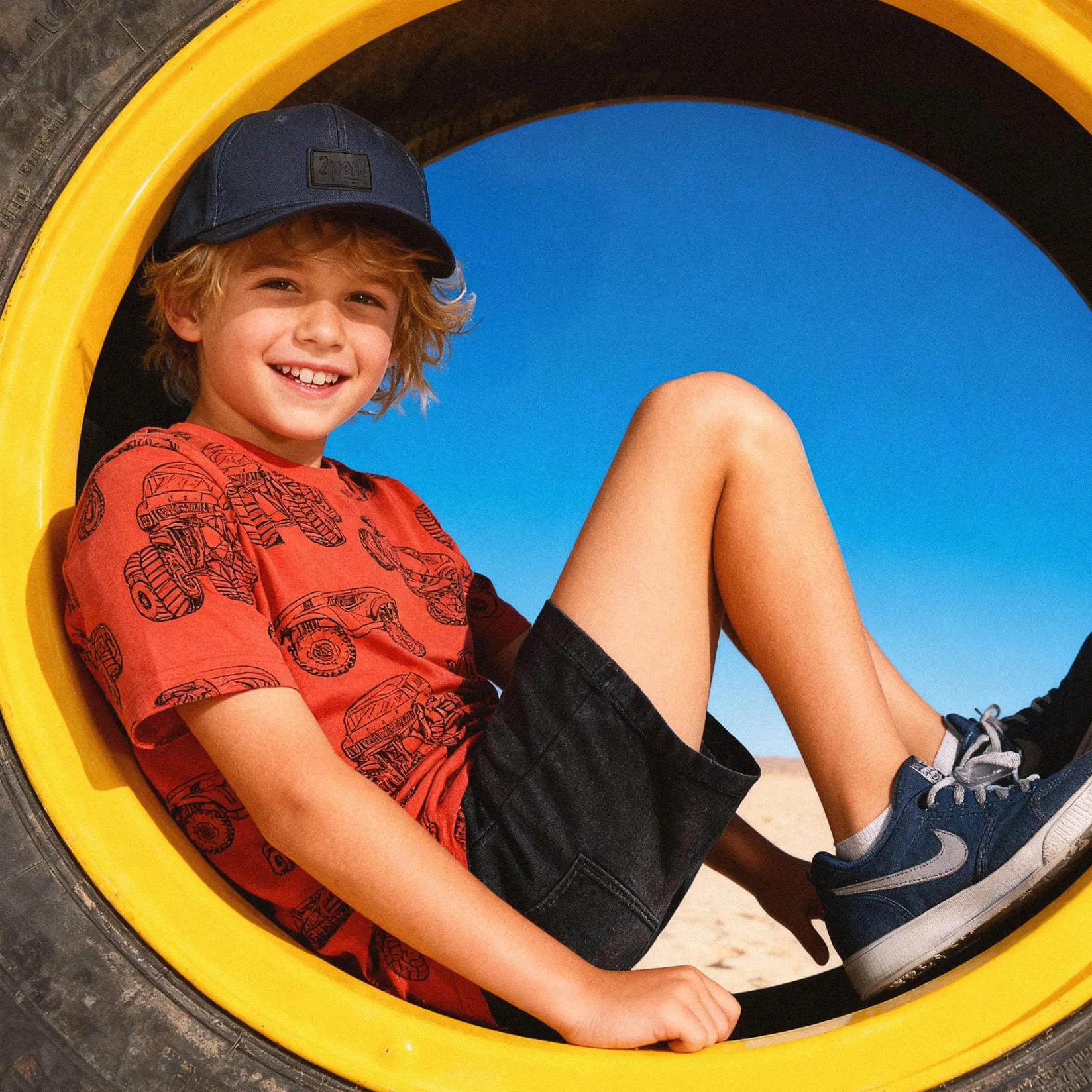 The organic cotton jersey t-shirt in blue with bicycle print is a playful basic for boys who love adventure. This short-sleeve tee showcases a fun bike and car allover print that bring movement and style to the look. Crafted in soft organic cotton jersey with a hint of stretch, it ensures breathability and all-day comfort.