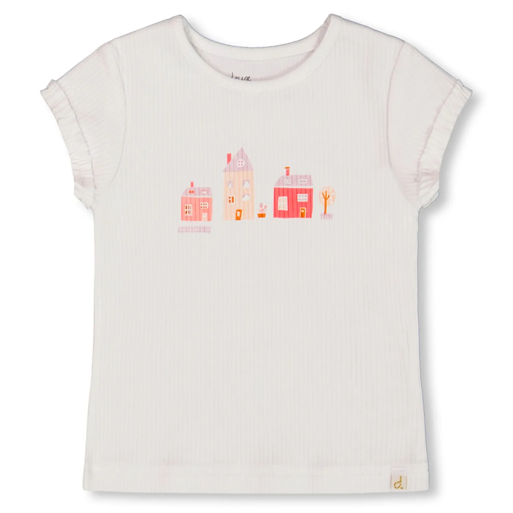 Its vertical ribbing adds subtle texture to our ribbed T-shirt with white print and pink houses. Very soft and comfortable to wear, this versatile t-shirt has a short-sleeved silhouette in stretch cotton with a round neck, gathered elastic sleeves and a house print on the chest. It goes perfectly with any bottom from our “La maison du Bonheur” collection!