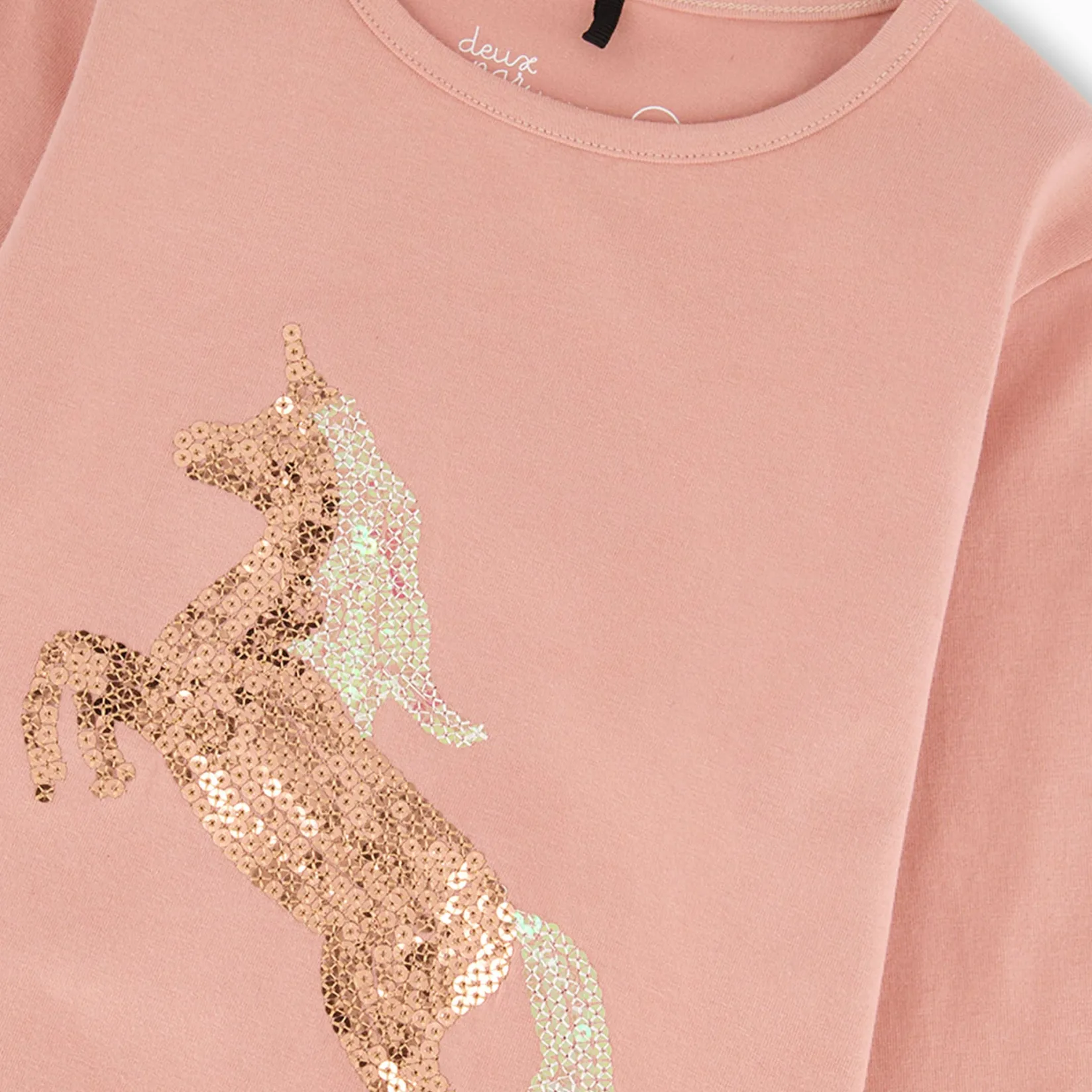 Made for dreamers, this Organic Cotton Long Sleeve T-Shirt Dusty Pink With Sequin Unicorn is a magical addition to any little dreamer’s wardrobe. Made from soft and stretchy organic cotton jersey, this long raglan sleeve tee features a rounded neckline and a shimmering unicorn on the chest crafted entirely from sequins. A charming and comfy choice for everyday adventures from the “Unicorns And Hearts” collection.