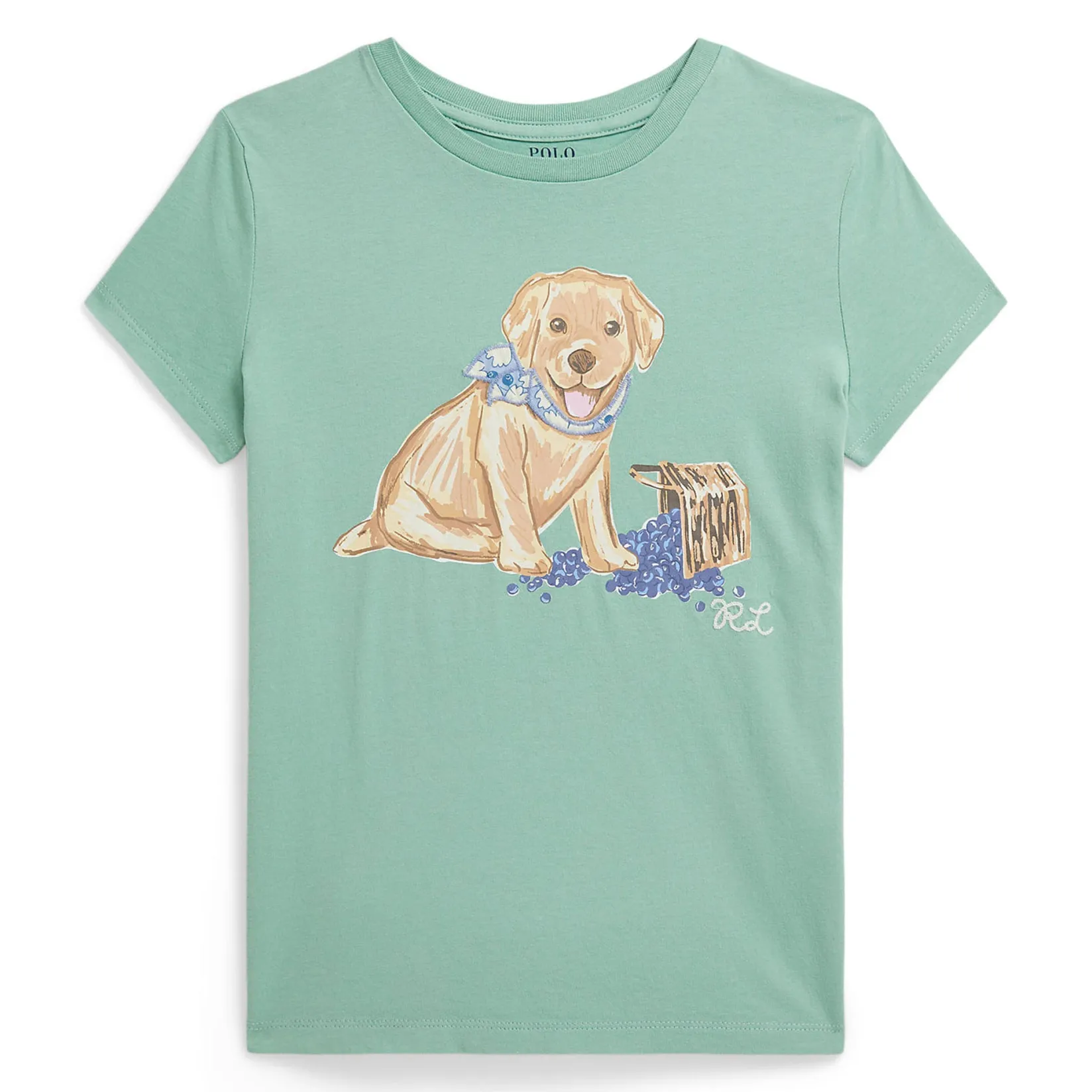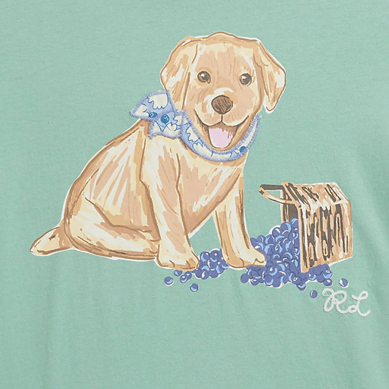 This cotton jersey tee is washed for added softness and features an adorable puppy printed alongside an overturned basket of blueberries.