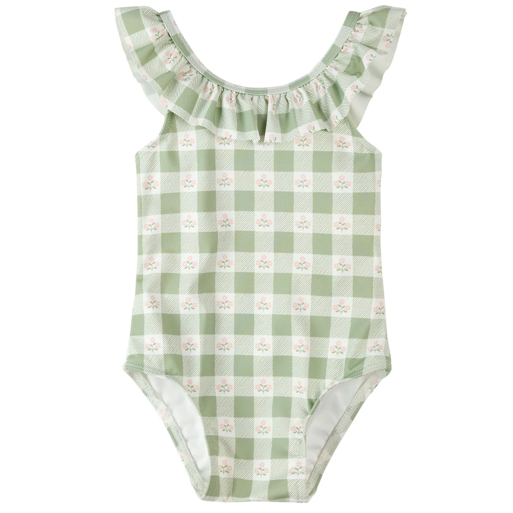 Gingham; the perfect pattern for summer, every summer. Fresh and sweet, this swim bodysuit features a minty gingham pattern and a frilly neckline that screams summer fun.  The timeless one-piece has her all set for fun by the pool or a cheerful family day at the beach. Offering UPF50+ sun protection, the weft knitted one-piece is stretchy, comfy and quick-drying – allowing her to dive into the water and back out to the sand time and time again.