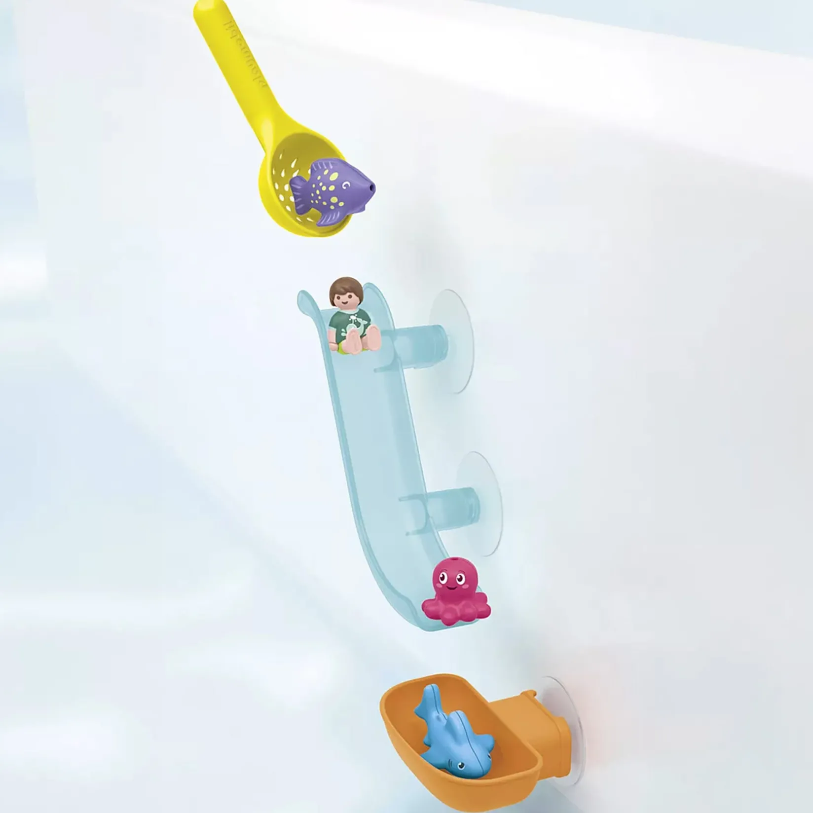 Fishing, catching, and having fun! With the large PLAYMOBIL slide and sea animals, endless joy is guaranteed! First, place the fish in the bathtub and then fish them out with the net. Once all the sea creatures are caught, they can slide down the slide. Both the slide and the landing platform can be attached to the bathtub walls with suction cups.