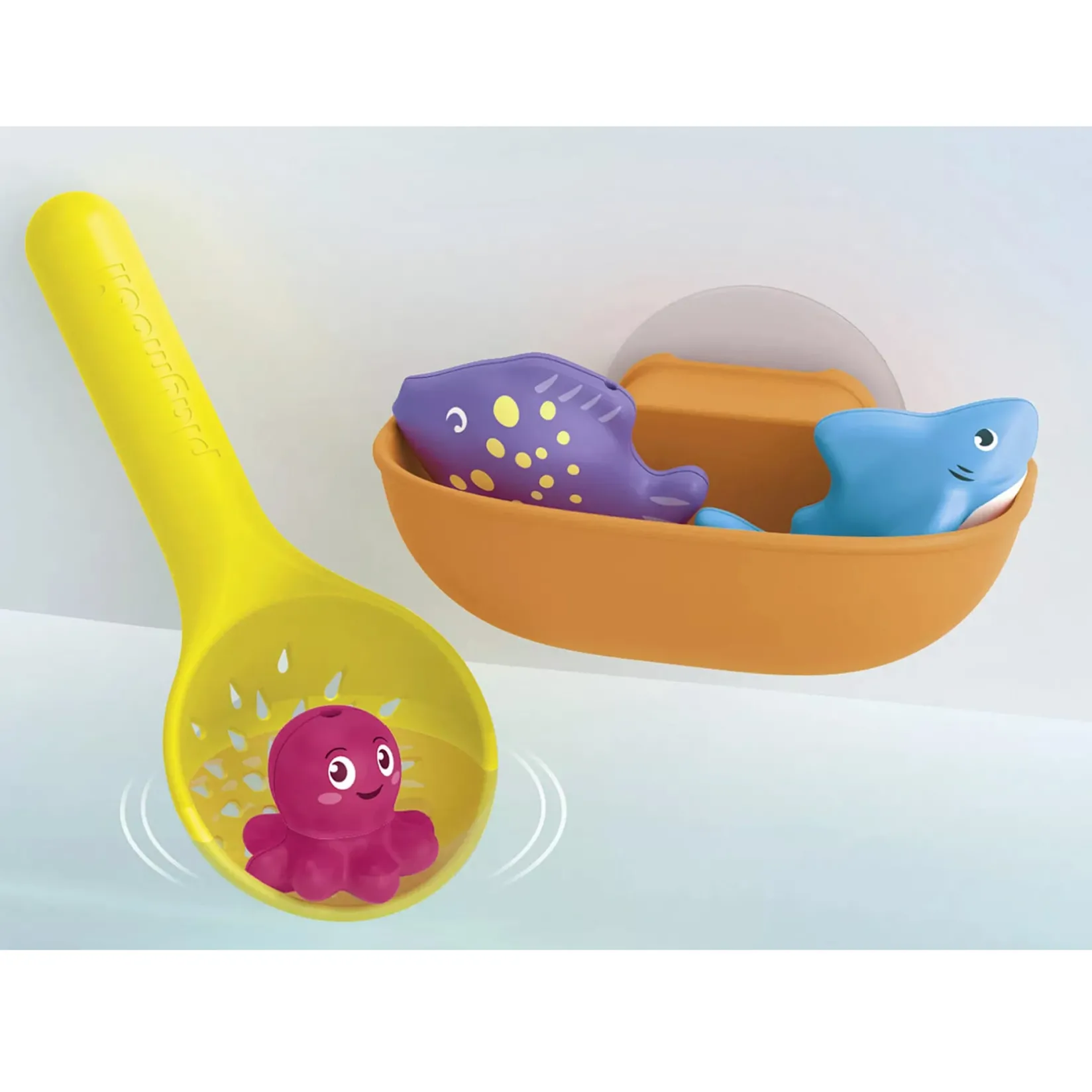 The little sea creatures swim in the water… Join your child in discovering fishing with the net and place them on the small tray to observe them. Includes a slide, a net, and three sea creatures. Slide dimensions: 13 x 8 x 9 cm (LxWxH). Tray dimensions: 12 x 6 x 10 cm (LxWxH).