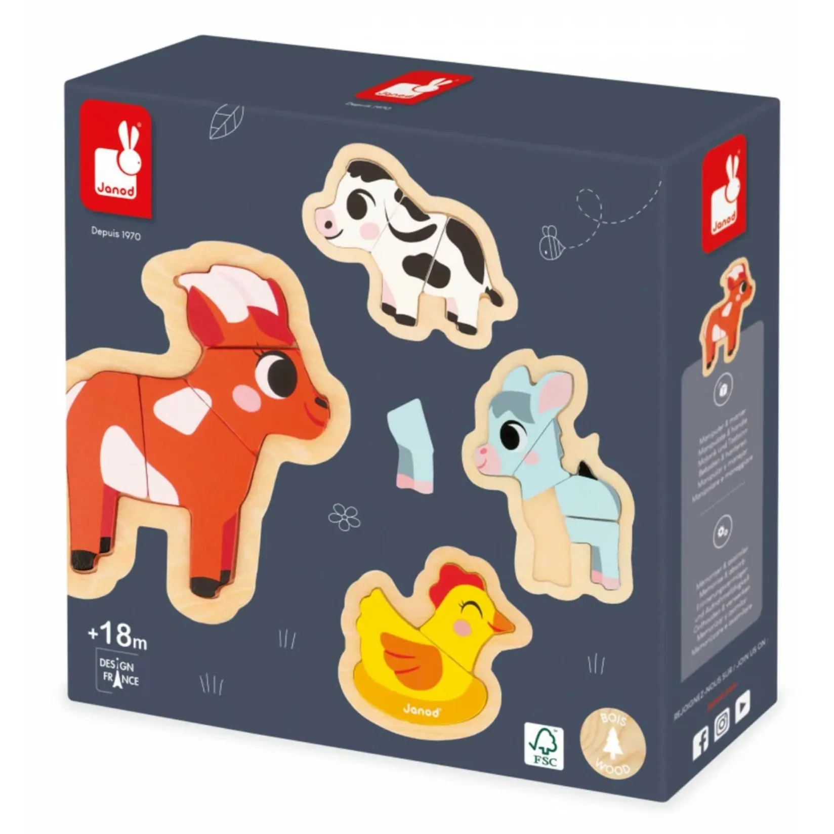 From the age of 18 months, children can begin to learn about the joys of puzzles! Perfect for developing fine motor skills and coordination! This set of 4 early-learning progressive puzzles will delight little farm animal lovers! With this wooden puzzle set – presented in a pretty gift box – which contains 4 puzzles, ranging from 2 to 5 pieces, children can have fun whilst progressing at their own pace. Featuring little ones’ favourite animals: a 2-piece hen, a 3-piece cow, a 4-piece goat and a 5-piece donkey. The pieces – which must be put back in the right order on the wooden stand – have been designed for babies to grasp onto them well. This early-learning game will be a true pleasure to play! This toy can also be used to prompt children to learn their first numbers. The puzzles are made from FSC® wood.