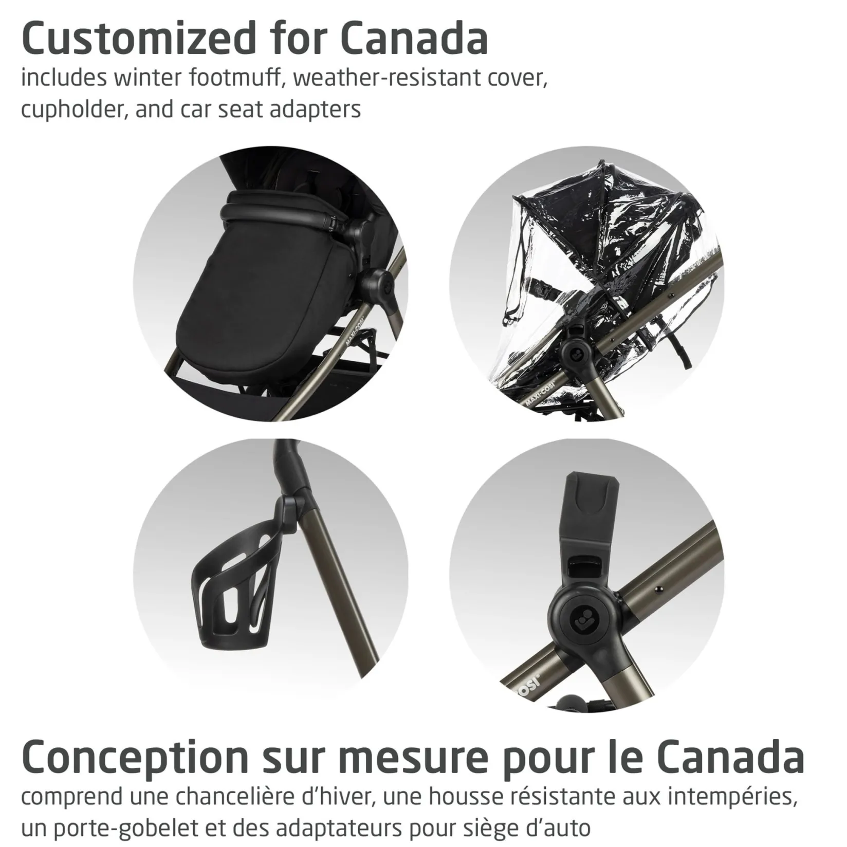 -Designed for Canada:Larger wheels for walks in the city or countryside, including a weather shield and an insulated foot cover to keep your child warm.